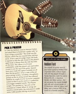 I came across this wonderful piece of Guitar madness in the book, Amazing Guitar Facts and Trivia. In 1984 Pat Metheny went to Manzer Guitars and asked them to build him a guitar with as many strings as possible. The result was the Pikasso, which has 2 sound holes and 4 necks. The Pikasso weighs 6.7kg, has 42 strings and when tuned to concert pitch is under 450kg of pressure.