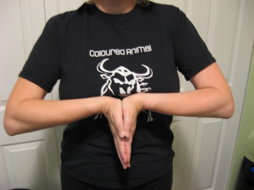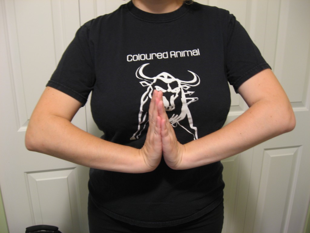 - Place your palms together in front of your chest. Push your hands downward as far as you can, keeping your palms flat together. You should feel the stretch on the inside of your wrists. Hold for 10 seconds.