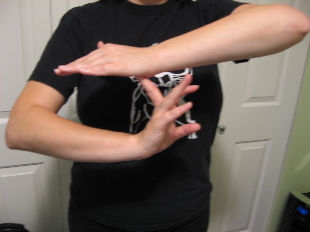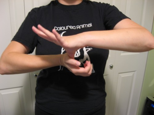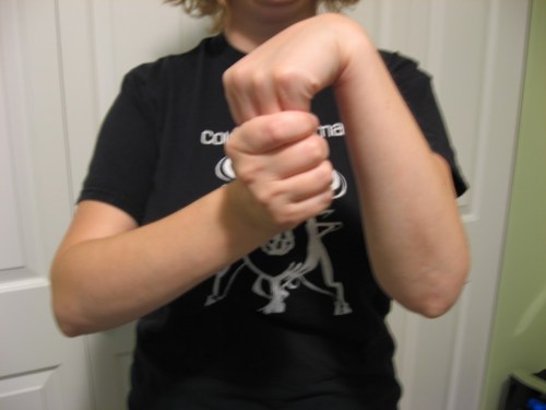 - With one arm, point your elbow down and keep your forearm vertical. Grab the fingers with your other hand and pull them toward the floor, keeping your forearm straight up. Pull until you feel a stretch in the top of your forearm. Hold for ten seconds on each arm.