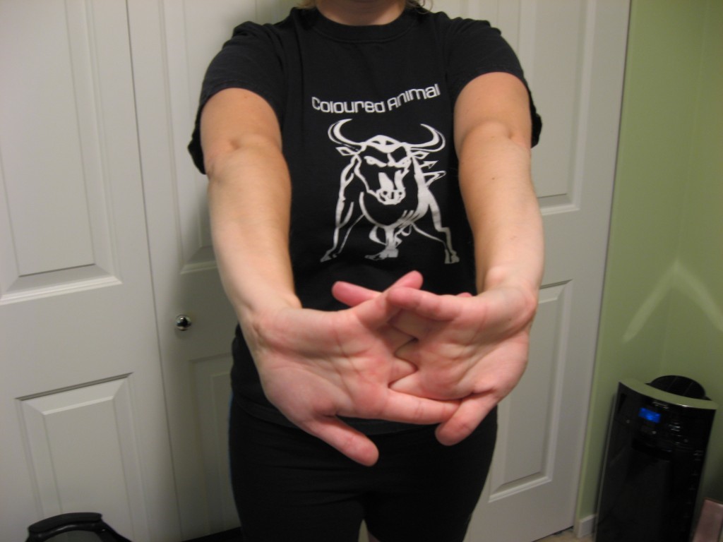 - Lace your fingers together in front of your chest and push your palms out in front of you. This will stretch your forearms, triceps, and shoulders. Hold for 12 seconds.