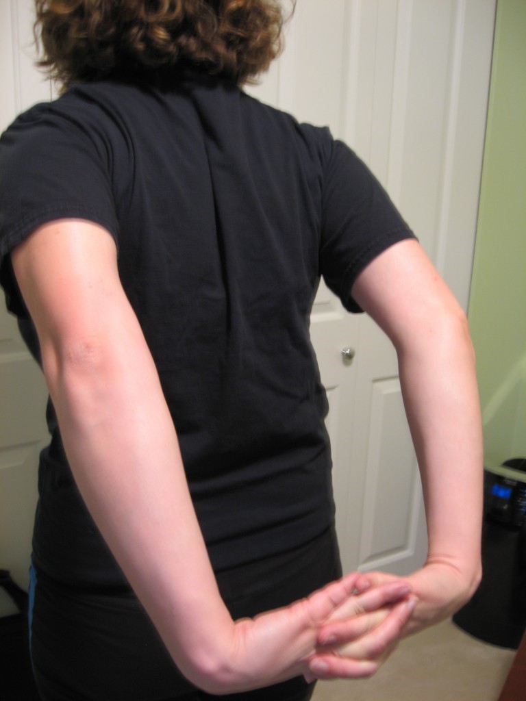 - Lace your fingers together again behind the small of your back. Pull your shoulders back and try to extend your arms out behind you. This will stretch your forearms, biceps, pecs, and shoulders. Hold for 12 seconds.