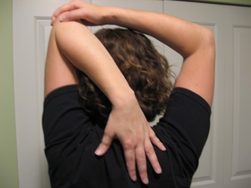 - With your arms above your head, grab one elbow with the other hand and pull your upper arm toward your ear. Try to reach behind your back with your free hand. This is a big tricep stretch. Hold each arm for 10 seconds.